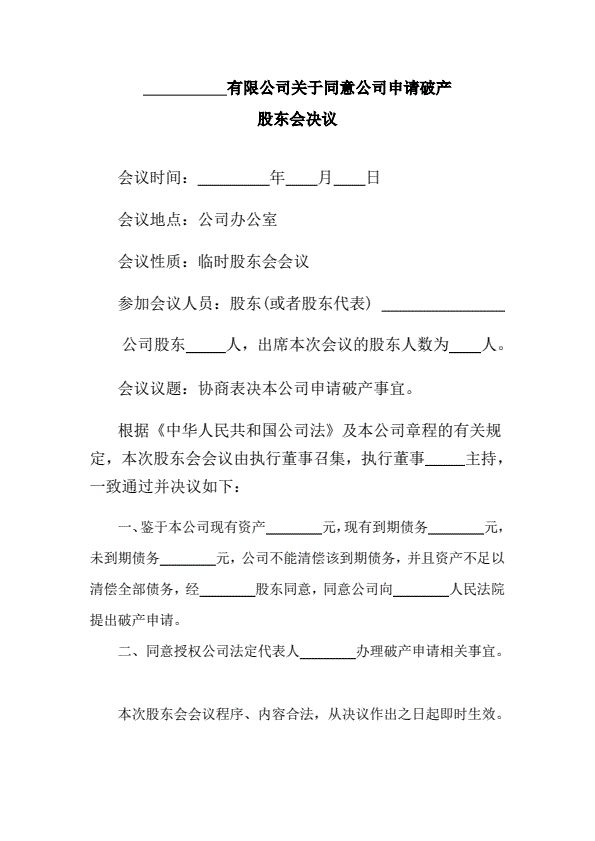 同意申请破产的股东会决议(指导版)