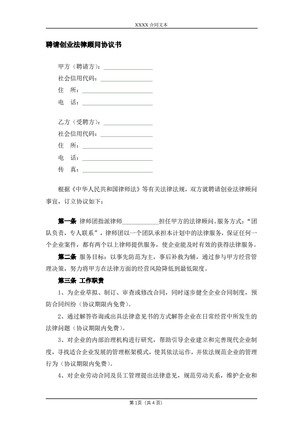 聘请创业法律顾问协议书