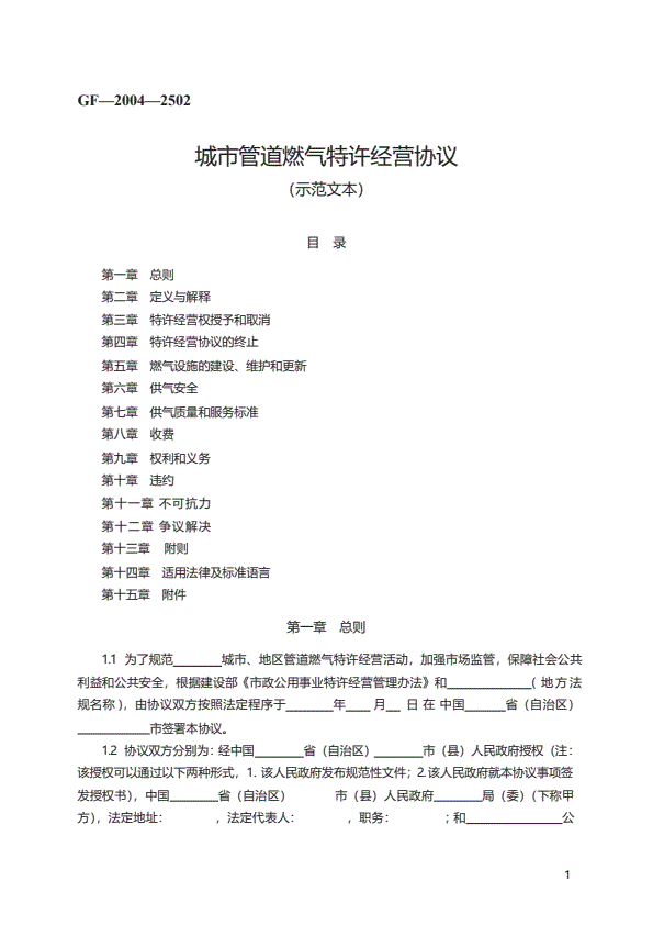 城市管道燃气特许经营协议 GF—2004—2502