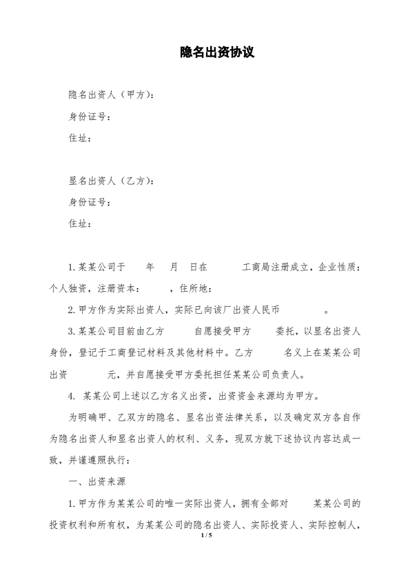 隐名出资协议
