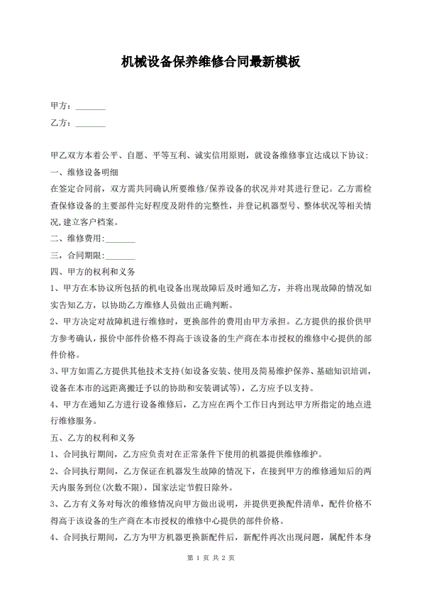 机械设备保养维修合同最新模板