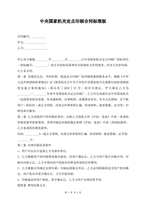 中央国家机关定点印刷合同标准版