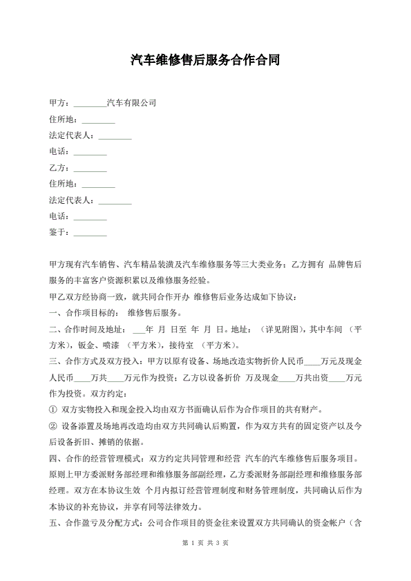 汽车维修售后服务合作合同