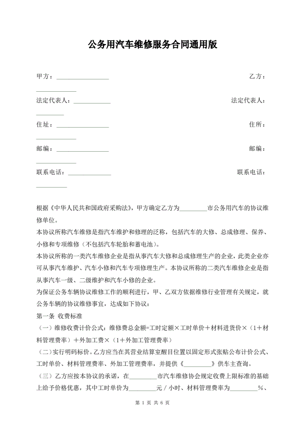 公务用汽车维修服务合同通用版