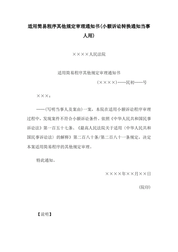 适用简易程序其他规定审理通知书(小额诉讼转换通知当事人用)
