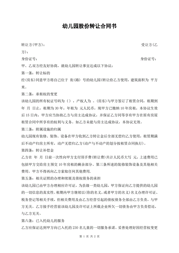 幼儿园股份转让合同书