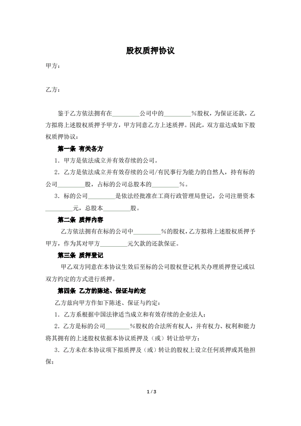 股权质押协议(指导版)