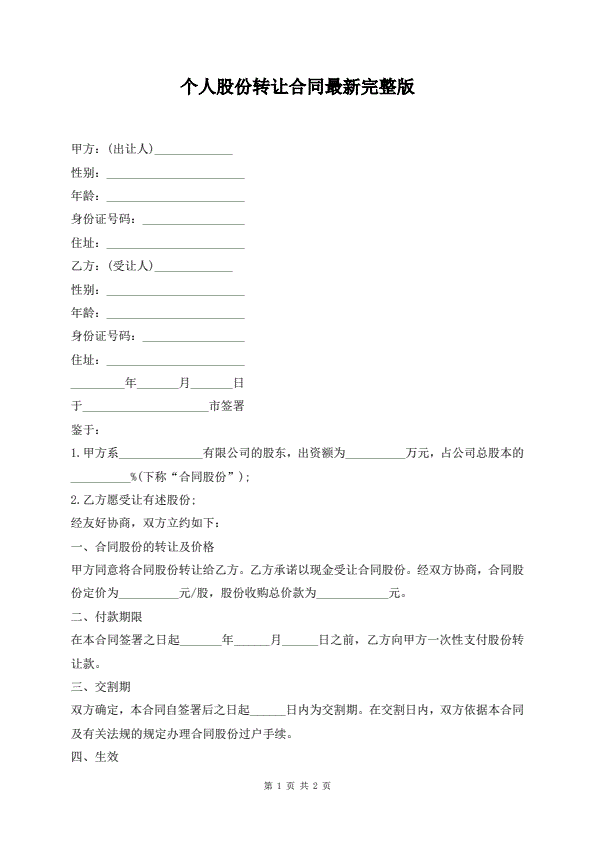 个人股份转让合同最新完整版