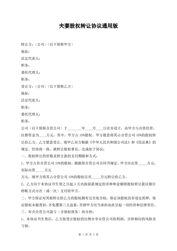 夫妻股权转让协议通用版