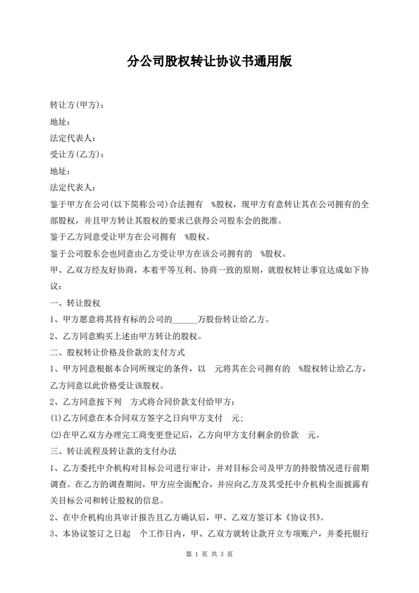 分公司股权转让协议书通用版