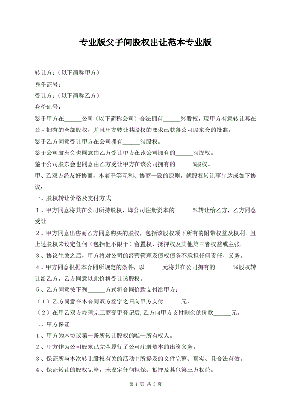 专业版父子间股权出让范本专业版