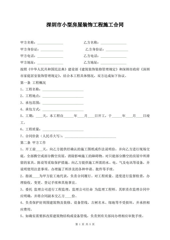 深圳市小型房屋装饰工程施工合同