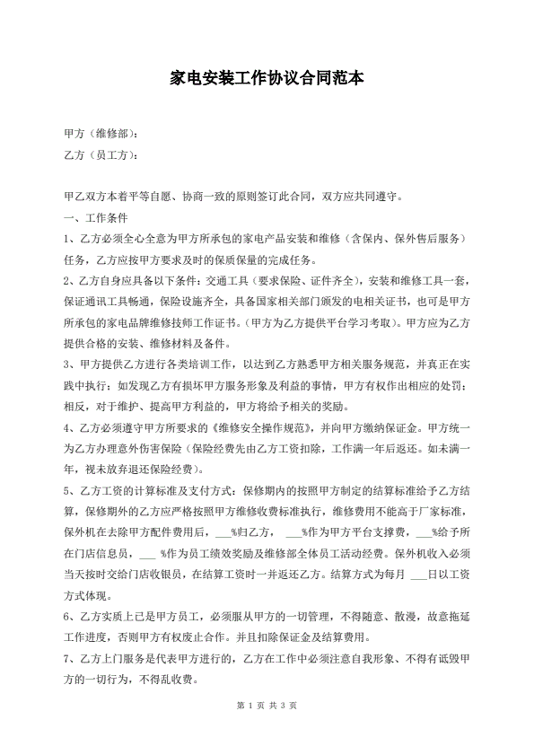 家电安装工作协议合同范本