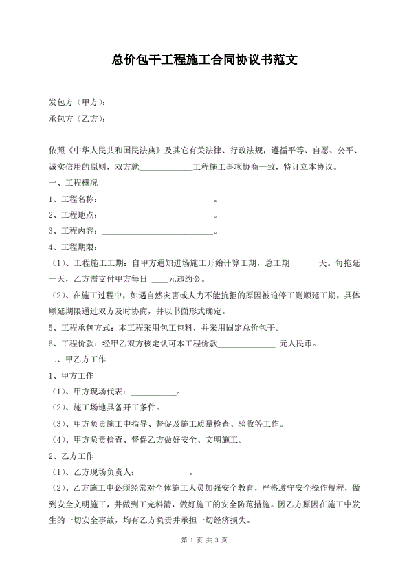 总价包干工程施工合同协议书范文