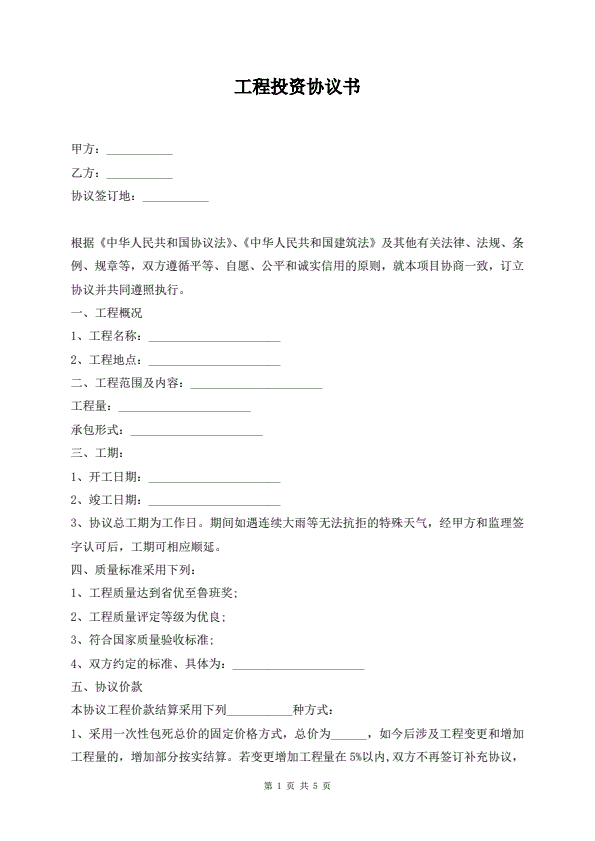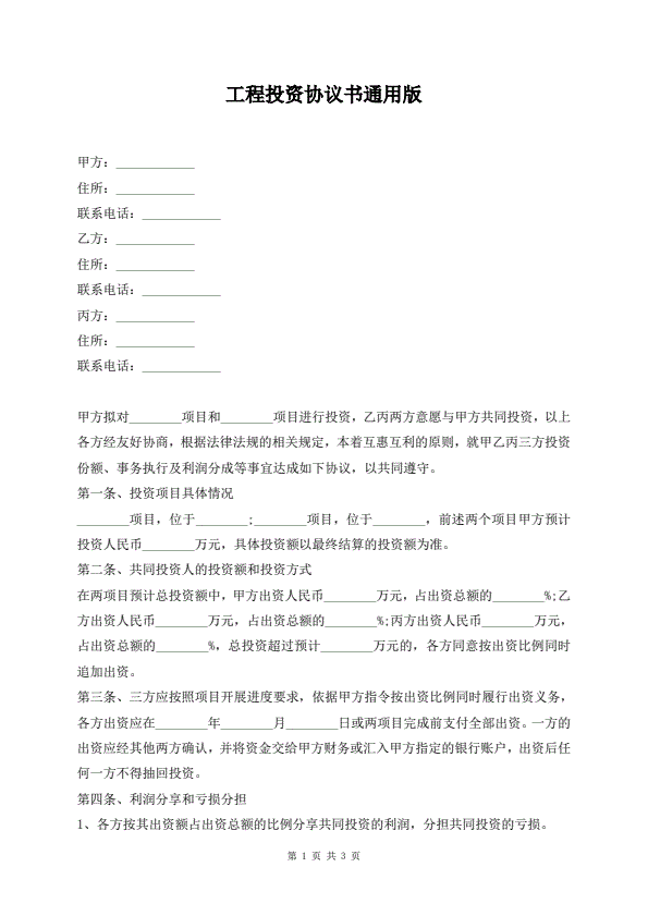 工程投资协议书通用版