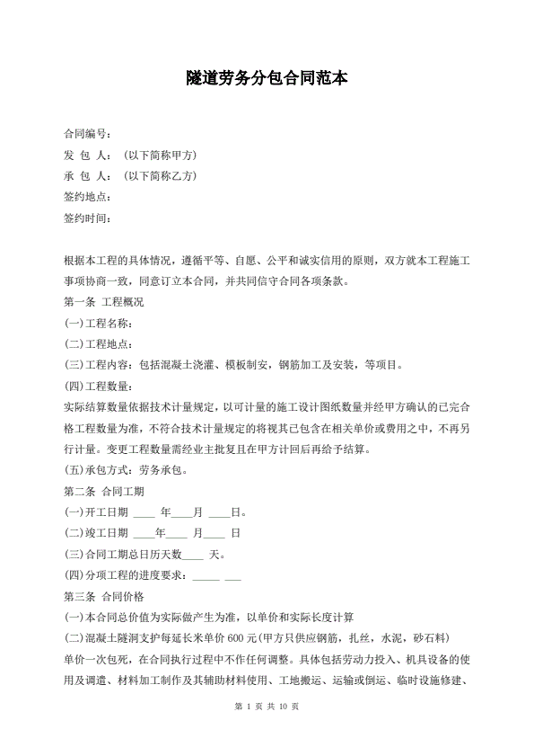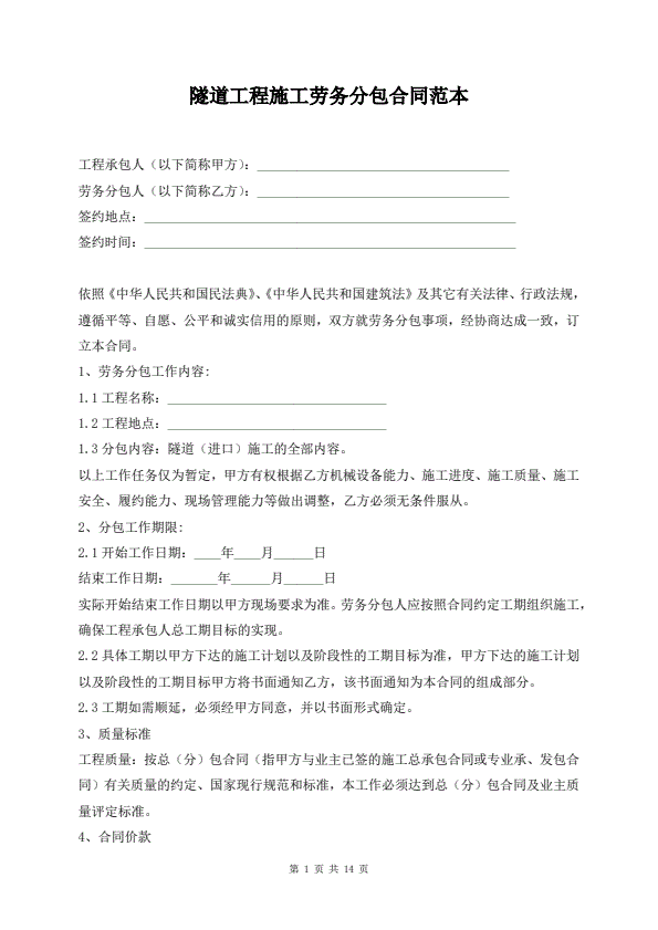 隧道劳务分包合同范本