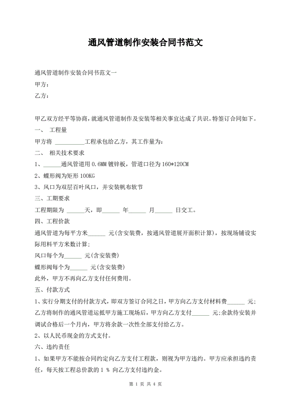 通风管道制作安装合同书范文