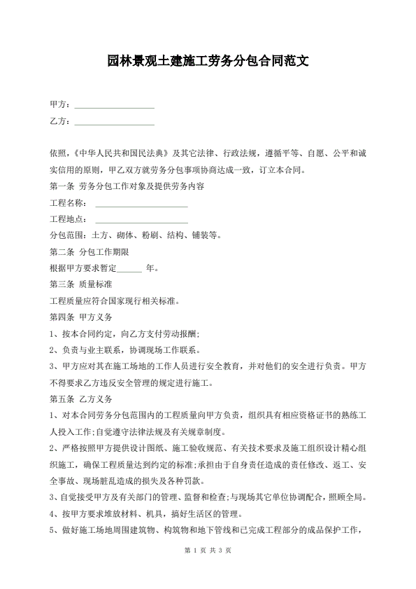 园林景观土建施工劳务分包合同范文