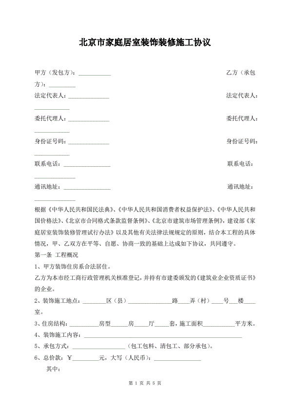 北京市家庭居室装饰装修施工协议