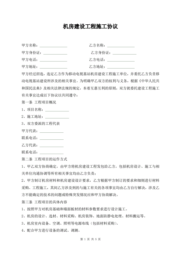 机房建设工程施工协议