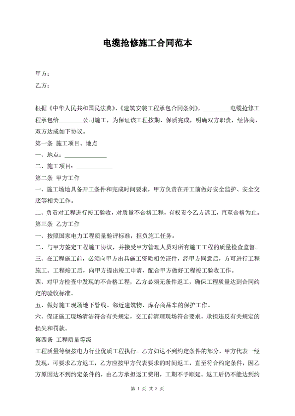 电缆抢修施工合同范本