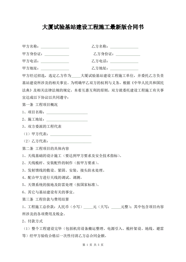 大厦试验基站建设工程施工最新版合同书