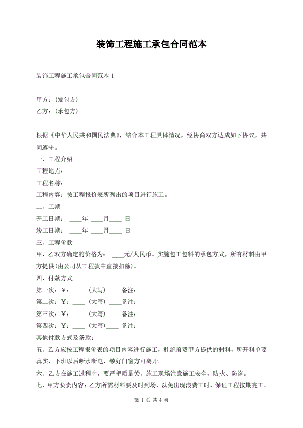 装饰工程施工承包合同范本