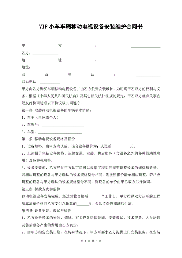 VIP小车车辆移动电视设备安装维护合同书
