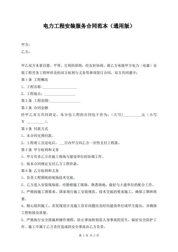 电力工程安装服务合同范本(通用版)