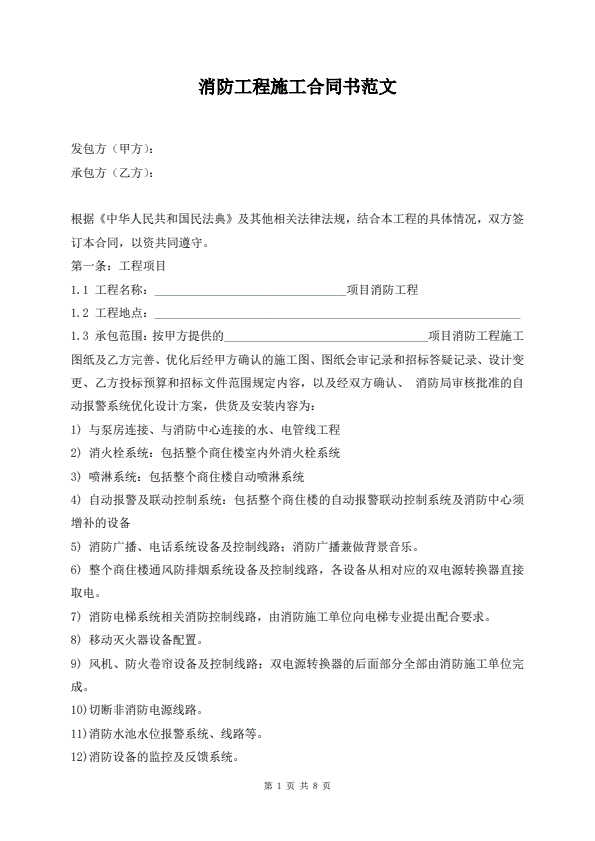 消防工程施工合同书范文