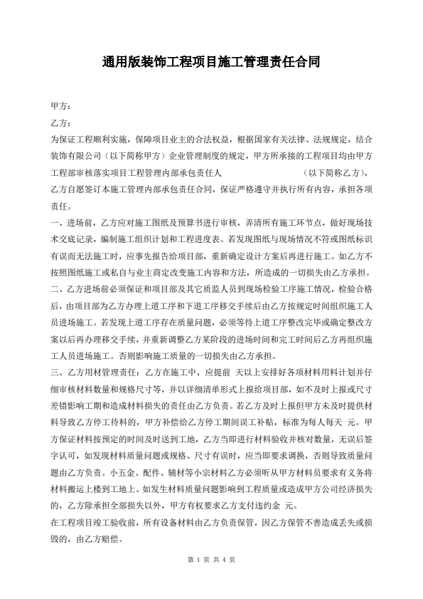 通用版装饰工程项目施工管理责任合同