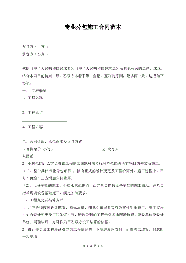 专业分包施工合同范本