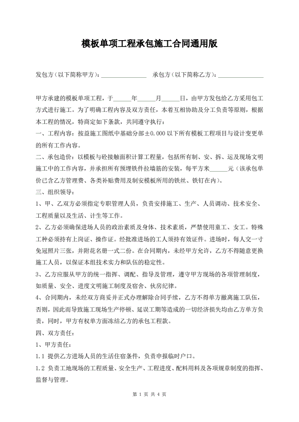 模板单项工程承包施工合同通用版