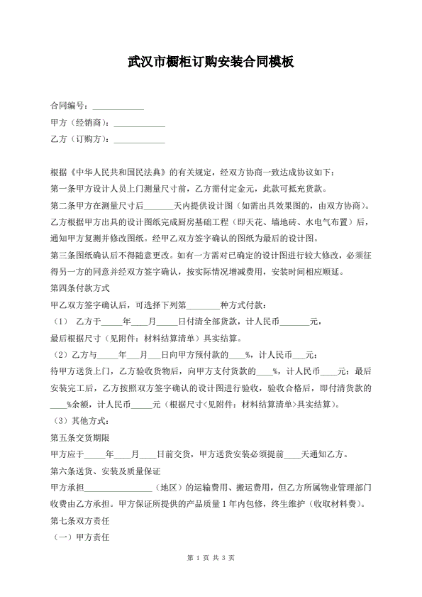武汉市橱柜订购安装合同模板