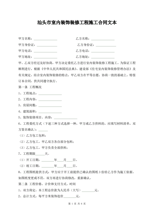汕头市室内装饰装修工程施工合同文本