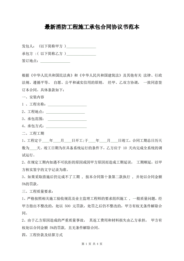 最新消防工程施工承包合同协议书范本
