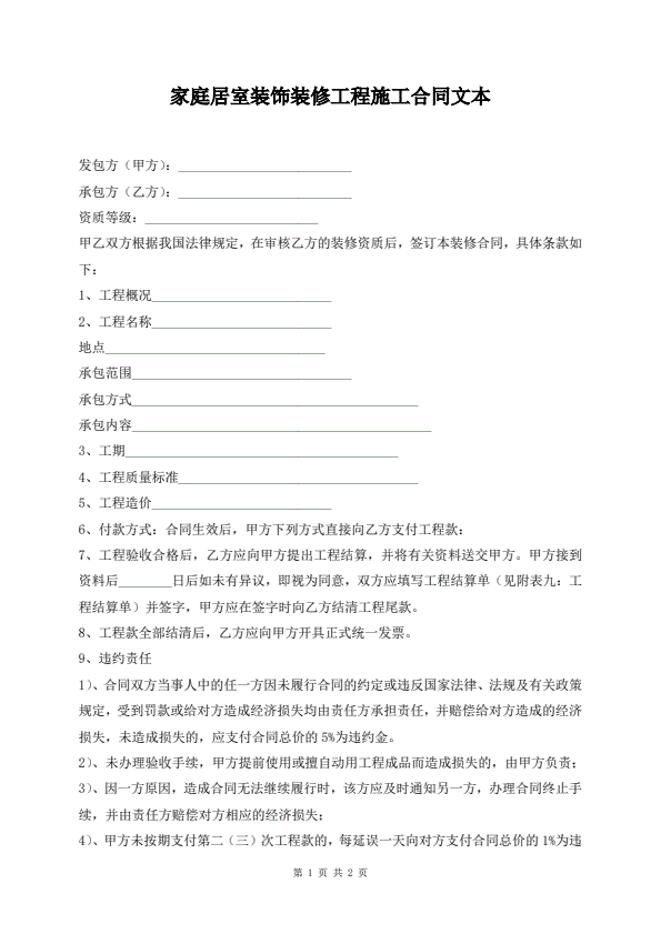 《家庭居室装饰工程施工合同》