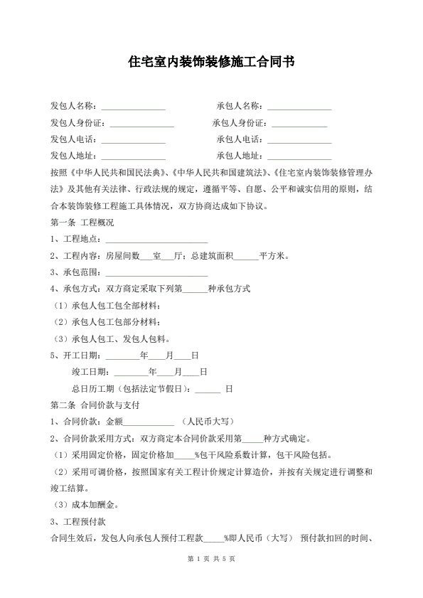 住宅室内装饰装修施工合同书