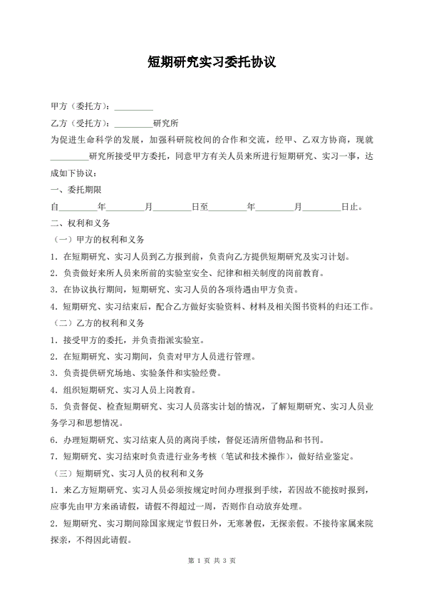 短期研究实习委托协议