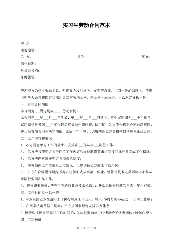实习生劳动合同范本