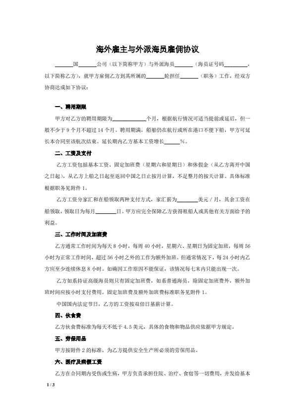海外雇主与外派海员雇佣协议