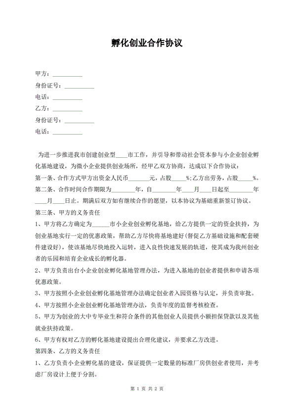 孵化创业合作协议