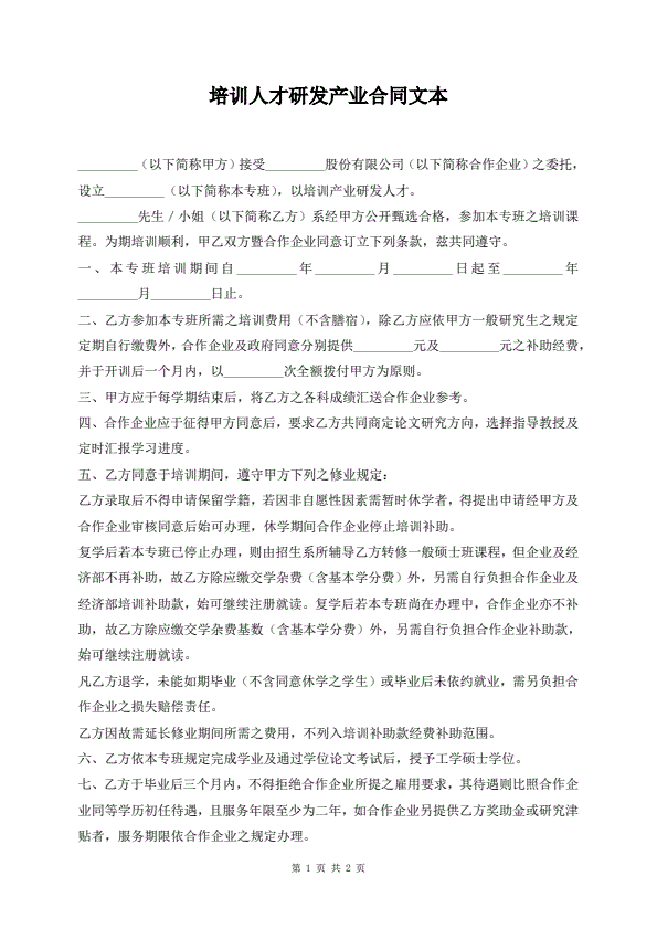 培训人才研发产业合同文本