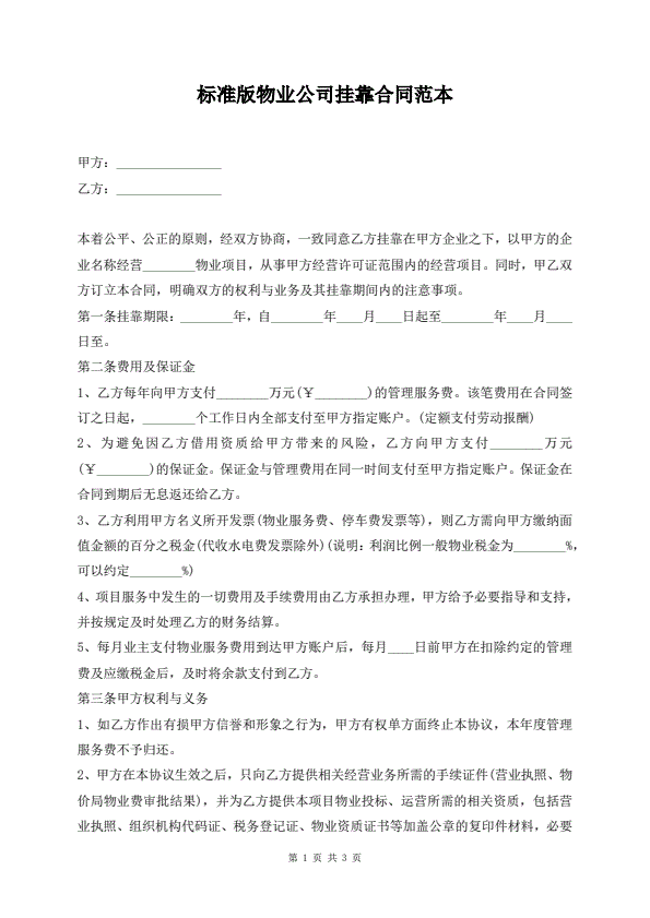 标准版物业公司挂靠合同范本