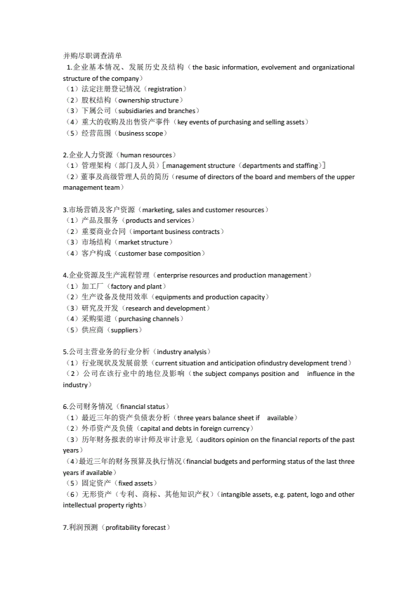 四大会计师事务所之一尽职调查所需资料清单-中英文对照