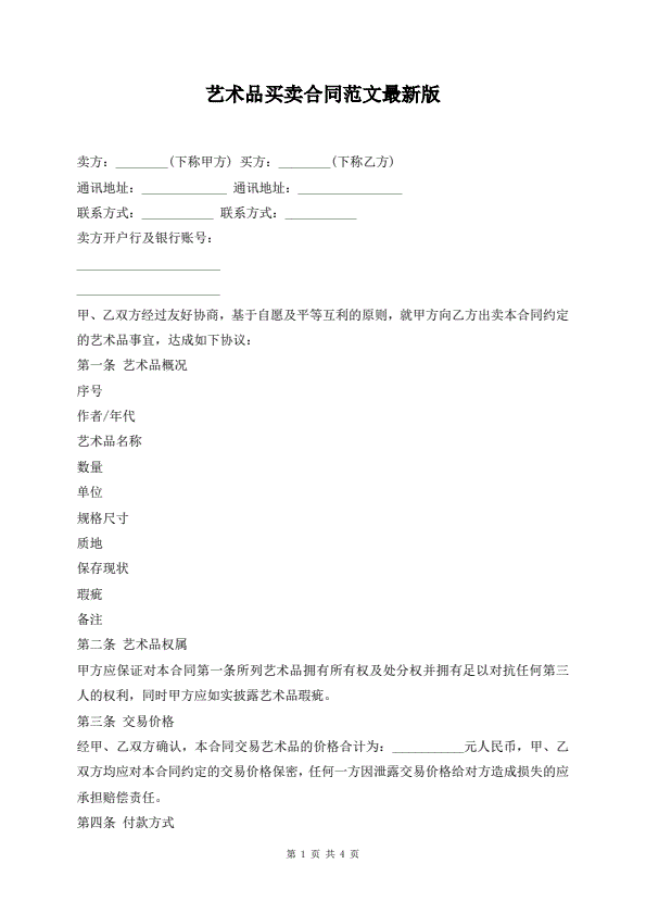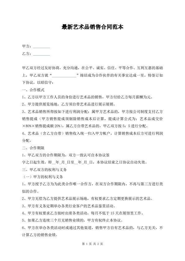 最新艺术品销售合同范本