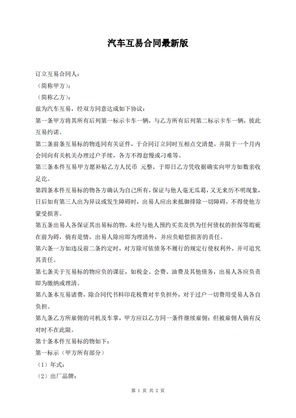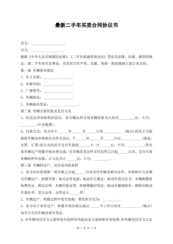 最新二手车买卖合同协议书