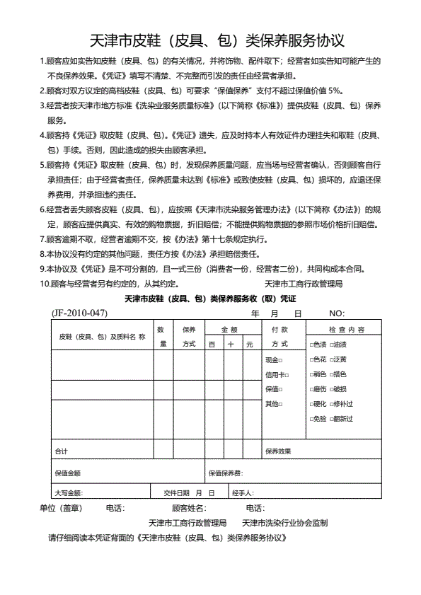 天津市皮鞋(皮具、包)类保养服务协议