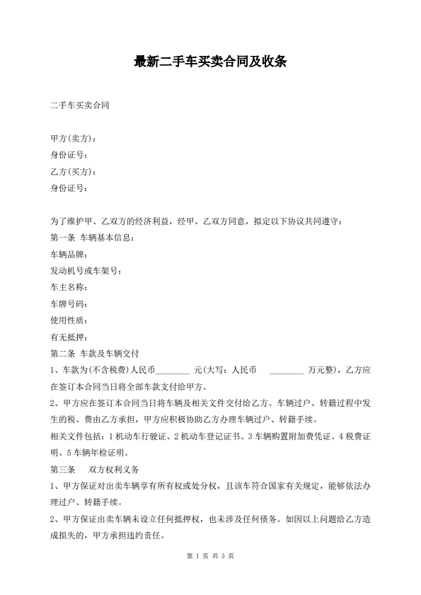 最新二手车买卖合同及收条