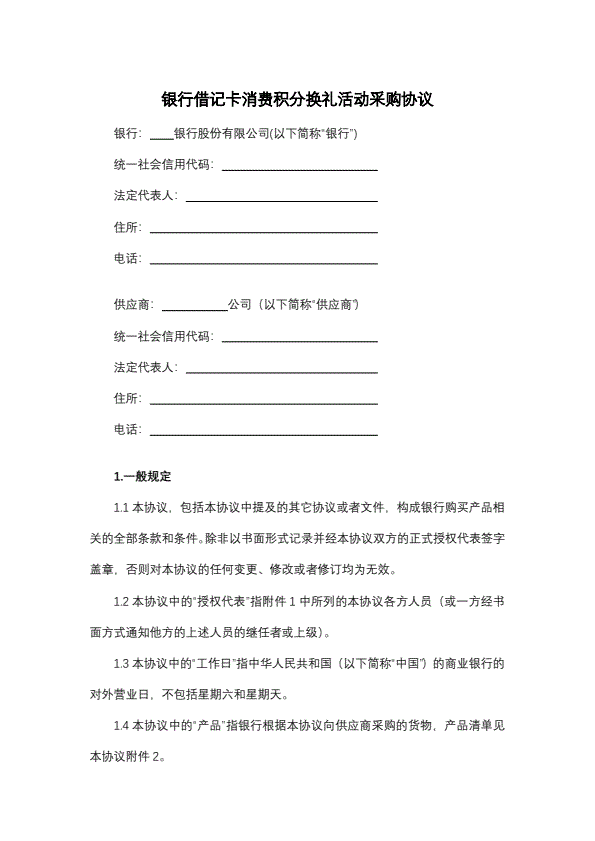 银行借记卡消费积分换礼活动采购协议